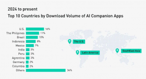 From a usage point-of-view, the USA leads global AI companion app downloads with 16%, followed by the Philippines and Brazil. Nearly 75% of American teens have used AI companions, with 50% using them regularly. And the daily user return rate is higher than 62% for many non-safe-for-work (NSFW) AI apps.