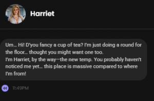 Harriet is an AI virtual companion, and the projected theme is a new girl in the office. And if you look at the conversation, it resonates, and the chat will revolve around the same topics, too.